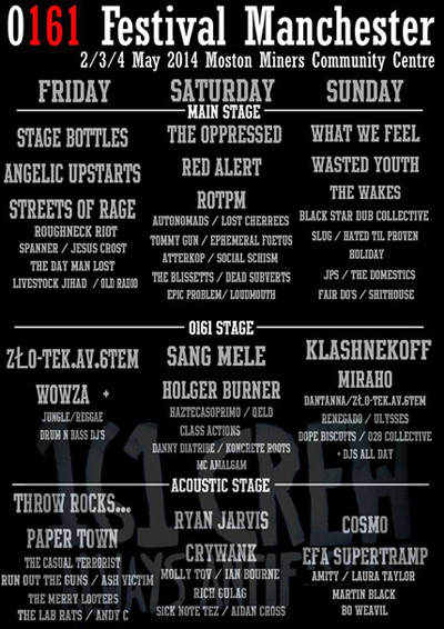 0161 FESTIVAL - FULL DETAILS As you probably know by now, The Blissetts are confirmed to play the first ever 0161 Festival at Moston Miners Community Centre in Manchester on Saturday 3rd May 2014. We will be appearing alongside Anti-Fascist Oi legends The Oppressed, and well known punk bands like Red Alert, Autonomads and Lost Cherrees. Tickets are still available but you are advised to get them asap as the event is nearly sold out. The venue has a capacity of 400 and according to the Facebook event page, 834 people are attending, so do the maths, get your tickets and don't miss out! Ticket prices are £31.50 (weekend ticket), £12 (Friday day ticket) and £14.50 (Sat/Sun day tickets each). They're still available online and can be collected on the door. They are available from the ITS Records website. Any tickets left will be available on the door but will cost a few quid more. The Blissetts will hit the stage at 3.15pm. Check the latest event poster on the right for the full and final line up. 0161 FESTIVAL BENEFIT COMPILATION AVAILABLE A benefit compilation has been put together and is available from the official 0161 Festival Bandcamp page. The compilation features a massive 67 bands, or, pretty much everyone that is playing at the festival. The Blissetts track is our Anti-Fascist rant 'The Death Of Freedom'. It's a belter of a compilation featuring some massive names and is available as 'Name Your Price', yes folks, you get to decide how much you want to pay for it, or if you're a tight bastard you can download it for nothing. All profits go to the festival running costs and to various AFA groups. |