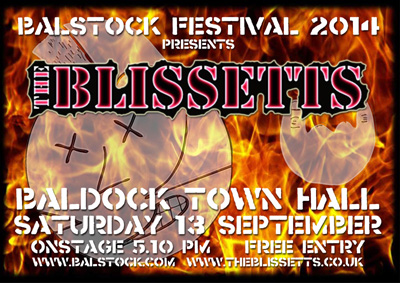 THE BLISSETTS RETURN FOR BALSTOCK FESTIVAL 2014 Following on from the 'Battle of Boston' way back in May this year, The Blissetts return to Baldock for the 2014 Balstock Festival, Hertfordshire's best FREE music festival which takes place from Friday 12th September to Sunday 14th September. This year sees The Blissetts hit the corridors of power that is Baldock Town Hall on Saturday 13th, yes really, that is where we are playing!!! So come and vent your spleen along with us when we hit the stage at 5.10pm. This is going to be fun!! So come along and support your local scene bands at one of the best FREE festivals there is, rather than the same old corporate toss spewed up at every mainstream festival. There's 200 bands over 3 days, full details on the Balstock website, and did we mention it's FREE? |
