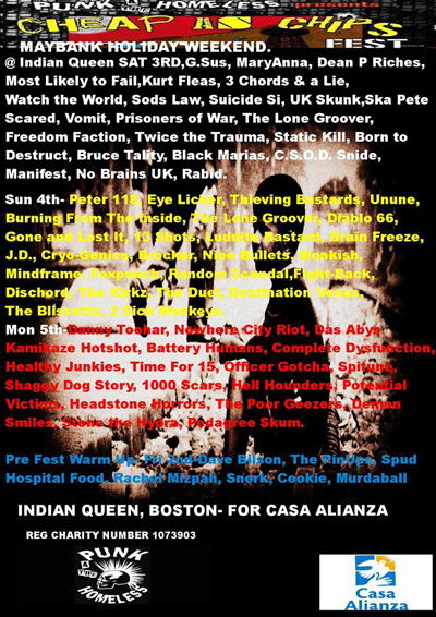 THE BLISSETTS HIT CHEAP AS CHIPS 2014 FESTIVAL We hit Boston, Lincolnshire, on Sunday 4th May 2014 to conclude our brief tour of the Midlands when we play at the 3rd Punk 4 The Homeless 'Cheap As Chips Festival'. Originally meant to take place at Anderbury Creek, just outside of Skegness, the Festival has been moved down the road to Boston after problems with the Venue. The same venue that hosted the first CAC Fest in 2011. The Festival takes place over 2 venues, The White Hart and The Indian Queen, Camping is available at The White Hart, however most of the festival will take place up the road at The Indian Queen. We will be linking up with loads of bands that we have played with before, including our mates Brocker, who will be smashing up The Indian Queen with us on the Sunday night. Also on the bill are Monkish, Fight-Back, whom we played with last year in Welwyn, Dischord, The Kirkz, Destination Venus, The Duel, Burning From The Inside and headliners 2 Sick Monkeys. Also on the bill over the weekend are Freedom Faction, Born To Destruct, Black Marias, Constant Source of Disappointment, Snide, Pedagree Skum and far too many others to list here. Brocker are on at 6.30pm and no doubt they will be onstage with us too at 11.30pm There is no admission fee but donations are invited. So put your hand in your pocket and help Eagle and the Punk 4 The Homeless crew along with Casa Alianza actually feed starving street children instead of big fat boardroom tossers who coin a fortune from most charities! |
