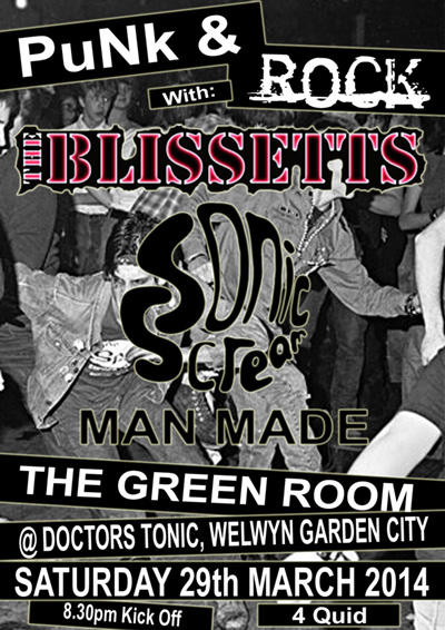 THE BLISSETTS HIT WELWYN We return to The Green Room in Welwyn Garden City on Saturday 29th March 2014 for a night of punk and rock which also has local bands Sonic Scream and Man Made on the bill. Doors open at 8.30pm and it's a fiver on the door. Anyone that has seen us at The Green Room will know that these gigs can be pretty mad, so we look forward to having the whole audience onstage with us again this Saturday! FULL DETAILS FOR 0161 AND CHEAP AS CHIPS FESTIVALS TO BE POSTED ON HERE NEXT WEEK We will be posting the final details and stage times of our gigs at the 0161 Festival and Cheap As Chips Festival next week. We play the 0161 Festival in aid of various Anti-Fascist organisations on Saturday 3rd May in Manchester and then we hit the Punk For The Homeless 'Cheap As Chips' Festival on Sunday 4th May. The CAC Fest was meant to take place at Anderbury Creek, just outside of Skegness but we understand the venue has now been changed to The Indian Queen in Boston. The 0161 Festival also features The Oppressed, Stage Bottles, Angelic Upstarts, Autonomads, Red Alert, Los Cherees and a whole host of well known punk bands new and old. Also, this festival has a hip hop stage which will see rising rap star Kalashnekof headline on the Saturday. Also there's an acoustic and open mic stage. Cheap As Chips features all the usual culprits, as well as us and our mates Brocker, there's Born To Destruct, Freedom Faction, Mispelt, The Duel, 2 Sick Monkeys and just about everybody on the underdog punk scene. |