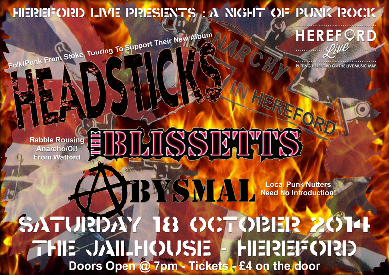 THE BLISSETTS HIT HEREFORD AND WATFORD The Blissetts hit Hereford for the first time on Saturday 18th October for a gig at The Jailhouse and then return to Watford for what will probably be the last gig of 2014. The Jailhouse gig in Hereford sees us line up alongside Stoke based folk punk band Headsticks who are currently on tour supporting their new album. Also playing are local Hereford cider swilling loons Abysmal, whom we have got to know quite well over the last year. This gig promises to be a total riot. It's £4 on the door and kick off is at 7pm. Here's the link for the Facebook event if you want to invite yourself along! Full details of the Watford gig will be announced shortly, but we play at The Flag on Saturday 29th November. The line up so far includes The Blissetts, Toxins and The Spacewasters with a lot more TBC. |