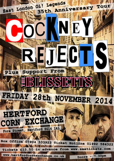 THE BLISSETTS SET TO KICK OFF 2015 AS SUPPORT TO THE ANTI-NOWHERE LEAGUE We have been confirmed to support the Anti-Nowhere League at The Flag in Watford on Saturday 2nd May 2015, courtesy of the Watford Punk Collective. Tickets are £15 in advance and it's highly recommended that you get them early. Also on the bill are The Breakdowns, The Vas Deferens and fellow local mob Peckham Rolex. Tickets are available online here or at The Flag. We will not be undertaking any gigs before the ANL gig, we will be releasing a full statement in the next few weeks which will detail the reasons why. Anyone who wants to put us on from May 2015 onwards, please drop us an email. THE BLISSETTS SUPPORTING THE COCKNEY REJECTS ON THEIR 35th ANNIVERSARY TOUR TThe Blissetts have been confirmed to support East End Oi! legends The Cockney Rejects on their second to last date of their 35th Anniversary tour at The Hertford Corn Exchange on Friday 28th November 2014. This will be a very special gig as not only are we suporting the Rejects, but our former bassist Ed Blissett will be back for one night only! Tickets are £13.50 in advance from www.seetickets.com or from the Corn Exchange Box Office on 07904 333923 or the Ticket Hotline on 01992 584322. Any remaining tickets will be available on the door and will usually cost more. Doors open at 7.30pm. |