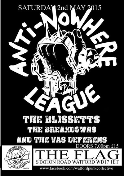 NEW YEAR - NEW BASSIST We're proud to announce that Andy, guitarist with fellow Watford band 'The Jelly Fiends' has joined The Blissetts and taken over the bass playing duties from Jason. Jason decided to, in his own words, 'step out of The Blissetts' and move on to other projects. We wish him well and thank him for the time he spent with us. Andy is a fellow Hornet and has been a long time fan and friend of The Blissetts since The Jellyfiends first crossed paths with us back in 2007 when both bands played at the 'Idiot Punkfest'. Having recently supported the legendary Toyah Wilcox at the O2 Academy, we approached Andy about taking over on bass just after Jay decided to leave. Also, Ed may be back now and again for the odd sporadic gig. Andy Blissett's first appearance with the band will be at our gig with the Anti-Nowhere League on our home turf of The Flag in Watford on Saturday 2nd May 2015. Tickets are now available and the link is below. NO GIGS BEFORE MAY 2015 We decided not to book any gigs for the first few months of 2015 due to the bass playing situation, but also due to the fact that Arup, The Blissetts testosterone fuelled guitar hero, will undergo a stomach operation in early March. We didn't want to take any risks with his health, given our history of near-exploding drummers and hedge trimmer accidents, so the Anti-Nowhere League gig is our first of 2015. Be there!! |