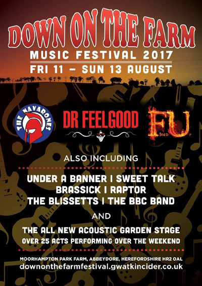THE BLISSETTS HIT DOWN ON THE FARM FESTIVAL THIS WEEKEND - TICKETS STILL AVAILABLE The Blissetts are set to open up the 6th Gwatkin Cider Company's 'DOWN ON THE FARM' FESTIVAL 2017 this Friday 11th August. We open the big stage set up in the Cider Barn at around 8.15pm. Tickets are still available for both Weekend plus Camping, and day tickets right up until mid-day on Friday 11th when the gates to the campsite open. There will also be pay on the gate admission. Here's the online ticket link: https://www.musicglue.com/down-on-the-farm/tickets/ We will also have our very popular 'Independent And Unrepentant' T-shirts on sale in the Merchandise area. Pint of Stoke Red please Denis! |