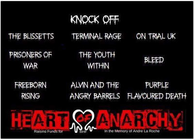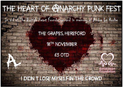 THE BLISSETTS RETURN TO HEREFORD FOR THE HEART OF ANARCHY PUNK FEST The Blissetts return to Hereford in November for the Heart Of Anarchy Punk Fest in aid of the British Heart Foundation. The Heart Of Anarchy Punk Fest takes place at The Grapes Pub on Saturday 18th November 2017. We play along side fellow Watford punk band Knock Off, as well as our longtime mates Terminal Rage and Hereford's finest young up and coming punk band The Youth Within. Also on the bill are On Trial UK, Prisoners of War, Bleed, Freeborn Rising, Alvin and the Angry Barrels and Purple Flavoured Death. It's £5 on the door and kicks off around mid-day. We should point out that this gig has been organised by Terminal Rage bassist Raphael La Roche, who sadly, lost his brother Andre to an undiagnosed heart condition ten years ago, which is why all proceeds from this gig are going to the British Heart Foundation. For anybody not attending the gig, you can still donate money to the British Heart Foundation via the Just Giving page that has been set up for the event. Click HERE for the HOA Just Giving Fundraising page. The Blissetts last adventure in Hereford was in 2014 when we played at the now sadly defunct Jailhouse. It was a mental night, which also featured Stoke on Trent's finest, Headsticks and local loons Abysmal. This night was historically important as it was when Paul first got his grubby hands on Gwatkin Cider, and has drank virtually nothing but, ever since! It also saw the first meeting of The Blissetts now legendary Twitter Army, believe us folks, they're not to be messed with. |