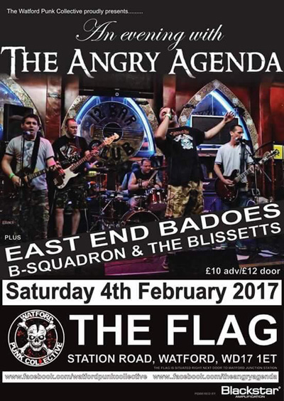 THE BLISSETTS ARE RETURNING TO WATFORD FOR THE FIRST GIG OF 2017! We make another inglorious homecoming to The Flag in Watford on Saturday 4th February 2017. The Watford Punk Collective proudly presents fellow Watford punk rock/oi herberts The Angry Agenda (featuring him from The Booze Boys), East End Badoes, B-Squadron and The Blissetts. Tickets are £10 in advance or directly over the bar at The Flag for the same price. On the door admission is £12 if you want to chance it, but tickets are understood to be selling quickly. Click here for The Watford Punk Collective advance ticket thing Or if you are on Facebook click here for the official WPC Event TThis is our first gig in our hometown since May 2015 when we stormed the place supporting the Anti-Nowhere League, which was our first appearance as a 5 piece band, so if you missed that gig, make sure you don't miss this one!! |